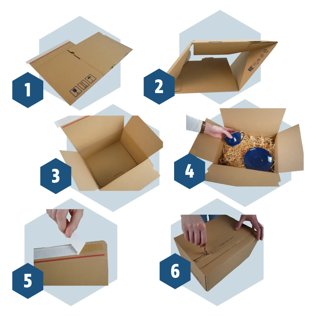 - Verschließen (optional): Viele Automatikkartons sind zusätzlich mit einem Selbstklebeverschluss ausgestattet. Das bedeutet, du musst nur den Schutzstreifen abziehen und den Deckel andrücken. Auch hier entfällt die Notwendigkeit, Klebeband und Schere zu verwenden.
