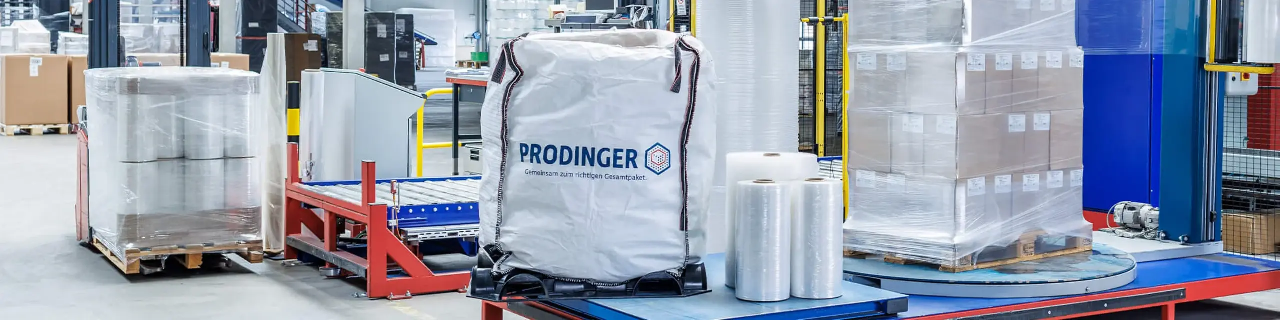 Freigestelltes Bild eines Big Bags von PRODINGER Verpackung, der auf einer Holzpalette steht.